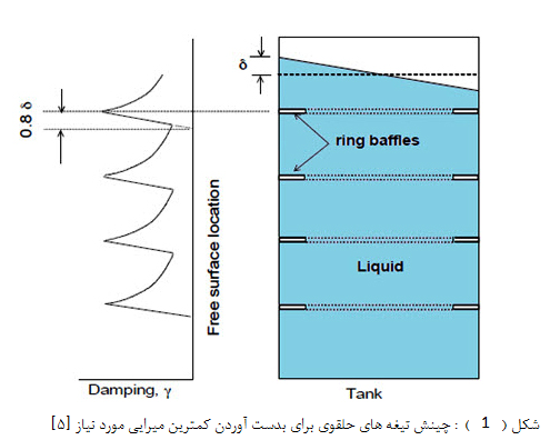 شکل 1، یک نمونه طراحی تیغه ها را به شکل شماتیک نشان می دهد. طرح سمت چپ، میرایی پیش بینی شده را به صورت تابعی از موقعیت سطح آزاد سیال نشان می دهد. همانطور که قابل مشاهده است، کمترین میزان میرایی زمانی به دست می آید که سطح آزاد سیال کمی پایین تر (حدود 0.86) از تیغه حلقوی می باشد.